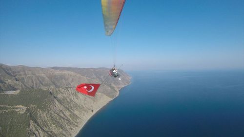 Tekirdağ'da yamaç paraşütü eğitmenleri, Cumhuriyet Bayramı'nı uçuşla kutladı. Türk bayrağıyla süzüldüler.