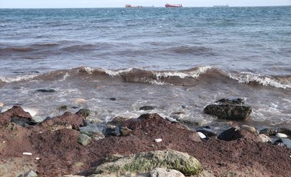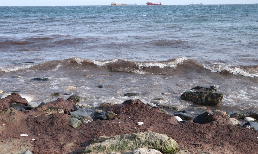 Tekirdağ'da kuvvetli rüzgar nedeniyle sahilin bir kısmı kırmızı yosunla kaplandı.