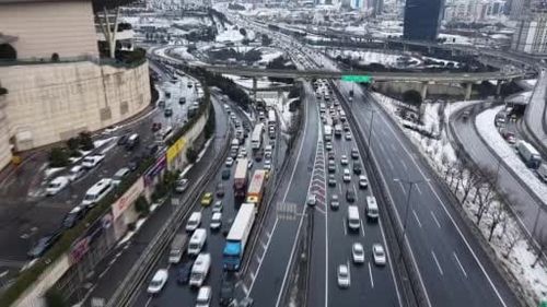 İstanbul'da akşam kar yağışı sonrası TEM otoyolu Mahmutbey Gişeleri'nde oluşan trafik havadan görüntülendi; kent genelinde yoğunluk yüzde 47’ye ulaştı.