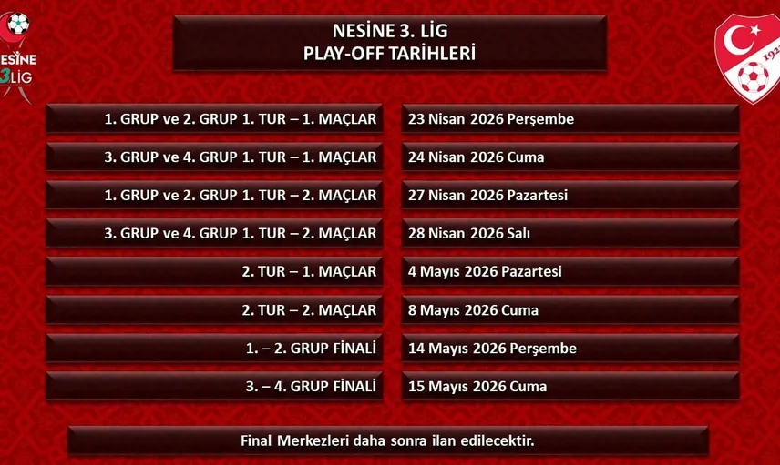 Türkiye Futbol Federasyonu (TFF), Trendyol 1. Lig, 2. Lig ve 3. Lig play-off tarihlerinin kesinleştiğini duyurdu. Finallerin oynanacağı merkezler daha sonra ilan edilecek.