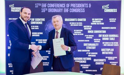 Türkiye Hentbol Federasyonu (THF) Başkanı Mesut Çebi,(solda) Avrupa Hentbol Federasyonu (EHF) Başkanlar Kongresi ve Olağan Genel Kurulu'na katıldı. Avusturya'nın başkenti Viyana’da düzenlenen toplantıda, Çebi'nin yanı sıra THF Uluslararası İlişkilerden Sorumlu Yönetim Kurulu Üyesi İsmet Yiğit Şenocak da yer aldı. Alanya'da 2025'te gerçekleştirilecek Avrupa Plaj Hentbolu Şampiyonası (8-13 Temmuz) ve Avrupa 17 Yaş Altı Plaj Hentbolu Şampiyonası'nın (3-6 Temmuz) sözleşmesi, THF Başkanı Çebi ile EHF Başkanı Michael Wiederer (sağda) arasında imzalandı.
