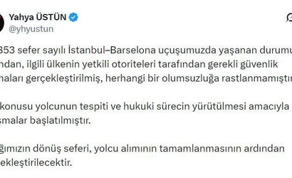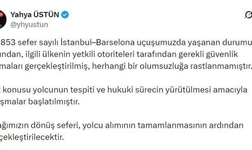 Türk Hava Yolları İletişim Başkanı Yahya Üstün yaptığı açıklamada, "İstanbul-Barselona uçuşumuzda yaşanan durumun ardından, ilgili ülkenin yetkili otoriteleri tarafından gerekli güvenlik aramaları gerçekleştirilmiş, herhangi bir olumsuzluğa rastlanmamıştır" ifadelerini kullandı.