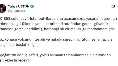 THY İletişim Başkanı Yahya Üstün: TK1853 seferinde güvenlik aramalarında olumsuzluk bulunmadı Türk Hava Yolları, İstanbul-Barselona seferini yapan TK1853 sayılı uçakta internet ağı üzerinden yapılan bomba tehdidine ilişkin yetkili makamların yürüttüğü aramalar sonucunda olumsuz bir bulguya rastlanmadığını duyurdu. Olayın seyri İstanbul-Barselona…