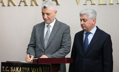 Ticaret Bakanı Ömer Bolat (solda), Sakarya Valiliği'ni ziyaret ederek, Şeref Defteri'ni imzaladı. Bolat'ı, Sakarya Valisi Rahmi Doğan (sağda) karşıladı.