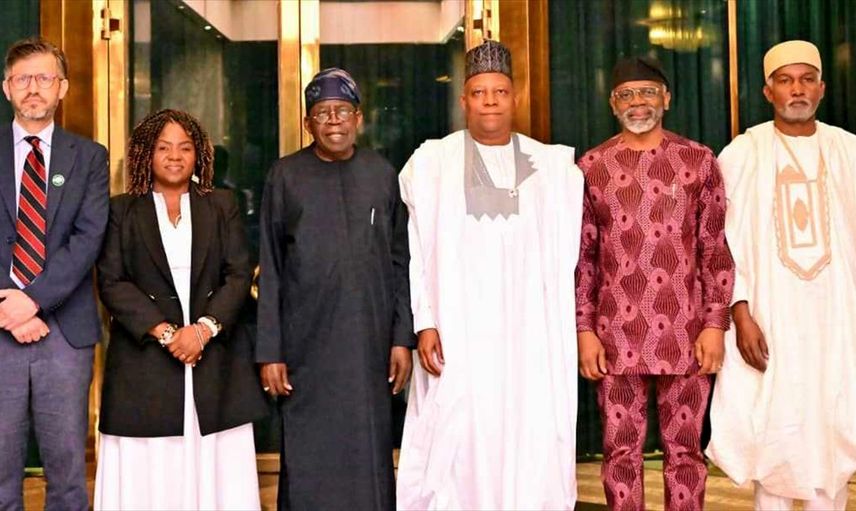 Nijerya Devlet Başkanı Bola Ahmed Tinubu (sol 3), başkent Abuja’da resmi ziyarette bulunan Kolombiya Cumhurbaşkanı Yardımcısı Francia Marquez’i (sol 2) kabul etti. Görüşmeye, Sebastian Longhust (solda), Devlet Başkanı Yardımcısı Kashim Shettima (sağda), Devlet Başkanlığı Özel Kalem Müdürü Femi Gbajabiamila (sağ 2) ve Dışişleri Bakanı Yusuf Maitama Tuggar (sağ 1) katıldı.