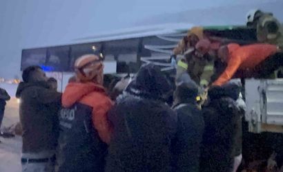 TOKAT’TA KARLI YOLDA KAYAN OTOBÜS, ARKADAN BİR TIRA ÇARPT. KAZADA ARAÇTA SIKIŞAN YOLCULARI KURTARMA ÇALIŞMALARI SÜRÜYOR.
