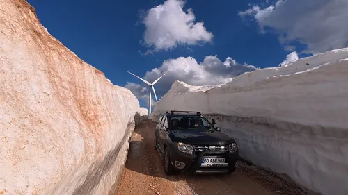 Tokat Reşadiye Bozcalı'da rüzgâr enerji santraline giden yol, metrelerce kar kütlesi arasında kaldı; doğa fotoğrafçısı Nazif Karakoç dronla görüntüledi.