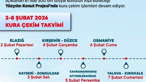 TOKİ'nin Yüzyılın Konut Projesi'nde 41 ilde kuralar tamamlandı; 144 bin 258 sosyal konutun hak sahipleri noter huzurunda belirlendi. 2-8 Şubat'ta 10 ilde daha kura yapılacak.