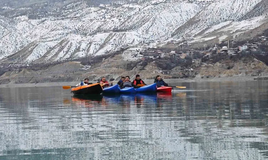 Kano yapan katılımcılar, gölün yaklaşık 100 metre derinliğe sahip bölümlerinde seyir yaptı ve toplamda 5 kilometrelik parkuru müzik eşliğinde tamamladı.