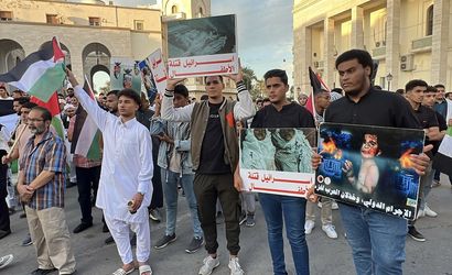 Gösteride, Filistin ve Libya bayraklarıyla meydana toplanan yüzlerce kişi, “Gazze izzetin toprakları” ve “Ey Kassam ey sevgili” gibi ifadelerin bulunduğu sloganlar atarken, “İsrail çocukları öldürüyor.” ve “Çocukların ölmesine hayır.” yazılı dövizler taşıdı.