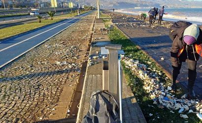 Trabzon'da etkili olan şiddetli fırtına sonucu Ayasofya sahilinde, yoğun dalgaların taşmasıyla çeşitli atıklar ve birikintiler oluştu.