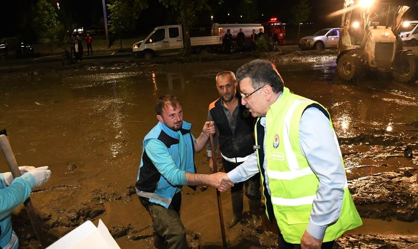 Trabzon Büyükşehir Belediye Başkanı Ahmet Metin Genç (sağda), kentte şiddetli yağışlar sonucu oluşan sel ve su taşkınlarından etkilenen bölgelerde incelemelerde bulundu.
