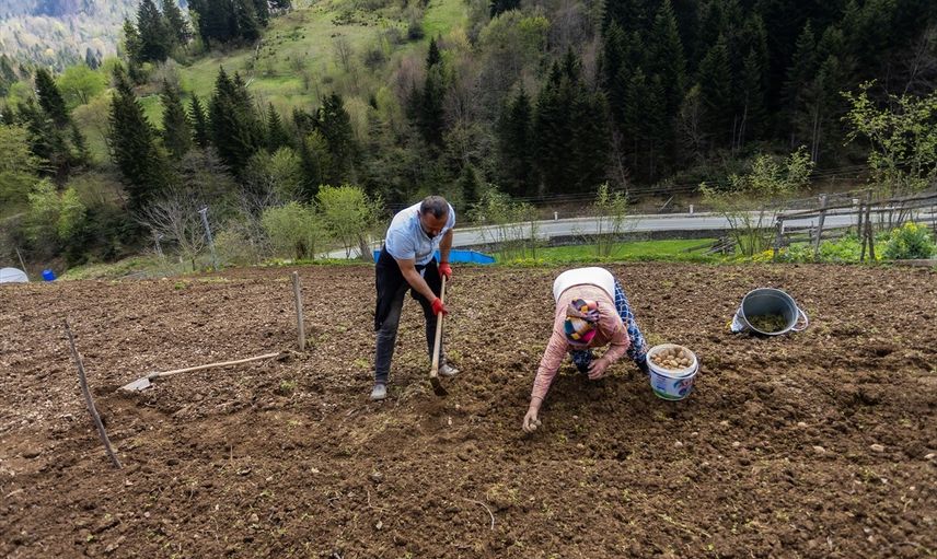 Trabzon'un Tonya ilçesine bağlı Kalınçam Mahallesi'nde, çiftçiler geleneksel yöntemlerle gerçekleştirdikleri patates ekim mesaisini yavaş yavaş tamamlıyor.