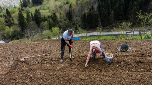 Trabzon'un Tonya ilçesinde çiftçiler, geleneksel yöntemlerle patates ekim mesaisinin sonuna yaklaşıyor.