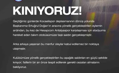 Kulüpten yapılan açıklamada şu ifadelere yer verildi: "Geçtiğimiz günlerde Kocaelispor deplasmanının dönüş yolunda Başkanımız Ertuğrul Doğan’ın aracına yönelik gerçekleştirilen eylemin ardından, bu kez de Antalyaspor karşılaşması için stadyuma hareket eden takım otobüsümüze taşlı saldırı gerçekleşmiştir. Arka arkaya yaşanan bu menfur olaylar kabul edilemez bir noktaya ulaşmıştır. Kulübümüze yönelik gerçekleştirilen bu aşağılık saldırıları en güçlü şekilde kınıyor; faillerin bir an önce tespit edilerek gerekli cezaları almalarını bekliyoruz".