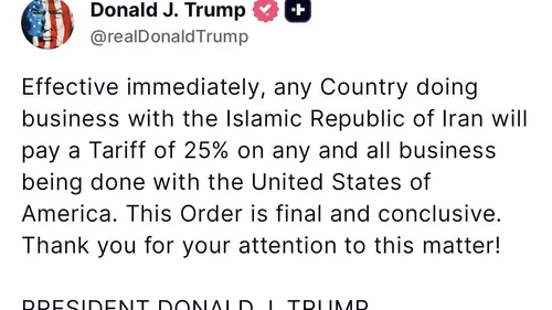 ABD Başkanı Donald Trump, İran ile iş yapan ülkelere ABD ile gerçekleştirdikleri ticarette yüzde 25 gümrük vergisi uygulanacağını Truth platformundan duyurdu.