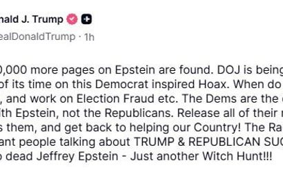 ABD Başkanı Donald Trump, Jeffrey Epstein ile ilgili belgelerin incelenmesine yönelik eleştirilerini yineleyerek, Adalet Bakanlığı'nın zamanını bu dosyalara harcamak zorunda bırakıldığını ileri sürdü. Sahibi olduğu Truth platformundan yaptığı açıklamada, Epstein dosyalarına ilişkin '1 milyon sayfa' yeni belgenin tespit edildiğini belirtti.