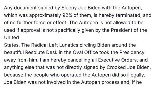 Trump, Biden döneminde imzaların "Autopen" ile taklit edildiğini ileri sürerek, bu şekilde doğrudan imzalanmadığını iddia ettiği tüm başkanlık kararnamelerini iptal etti.