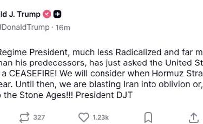 Trump paylaşımında, 'İran’da yeni rejimin lideri, öncekilerden çok daha az radikalleşmiş ve çok daha zeki bir kişi olarak, ABD’den ateşkes talep etti' ifadelerine yer verdi.