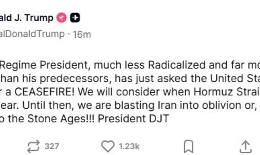 Trump paylaşımında ayrıca, 'O zamana kadar İran’ı yerle bir edeceğiz ya da deyim yerindeyse taş devrine döndüreceğiz' ifadelerini kullandı.
