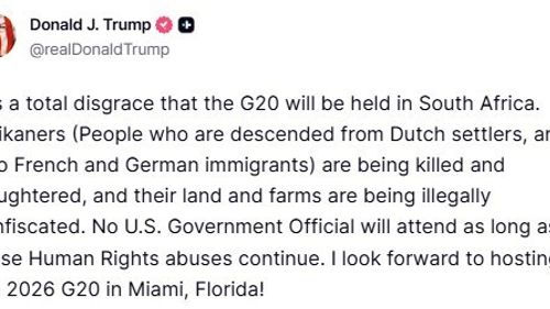 Trump, Johannesburg'da 22-23 Kasım'da yapılacak G20 Zirvesi'ni 'tam bir rezalet' olarak nitelendirip, insan hakları ihlalleri devam ettiği sürece ABD yetkililerinin katılmayacağını açıkladı.