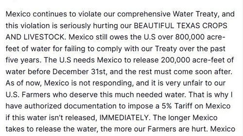Trump, Meksika'nın su anlaşmasını ihlal ettiğini savunarak 31 Aralık'a kadar 200 bin akre-fit su verilmezse yüzde 5 gümrük vergisi uygulanacağını açıkladı.