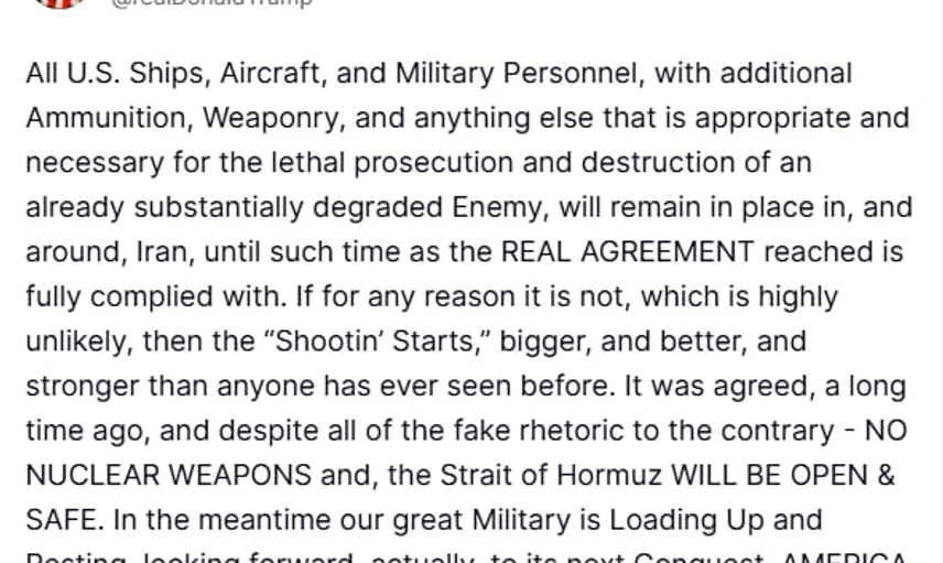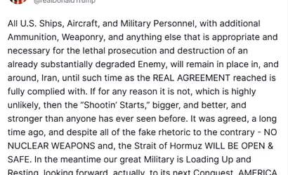 Trump, paylaştığı mesajlarda askeri varlığın ve lojistik desteğin sürdürüleceğini ifade ederek şunları söyledi: "Zaten büyük ölçüde zayıflatılan düşmanın ölümcül bir şekilde imha edilmesi için gerekli olan ek mühimmat, silah ve malzemelerle donatılan tüm ABD gemileri, uçakları ve askeri personeli, varılan gerçek anlaşmanın hükümleri tam olarak yerine getirilene kadar İran ve çevresinde kalacak."
