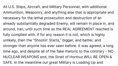 Trump, Truth üzerinden yaptığı açıklamada, İran anlaşmasına uyulmazsa daha güçlü saldırıların başlayacağını ve Hürmüz Boğazı'nın güvenli kalacağını söyledi.
