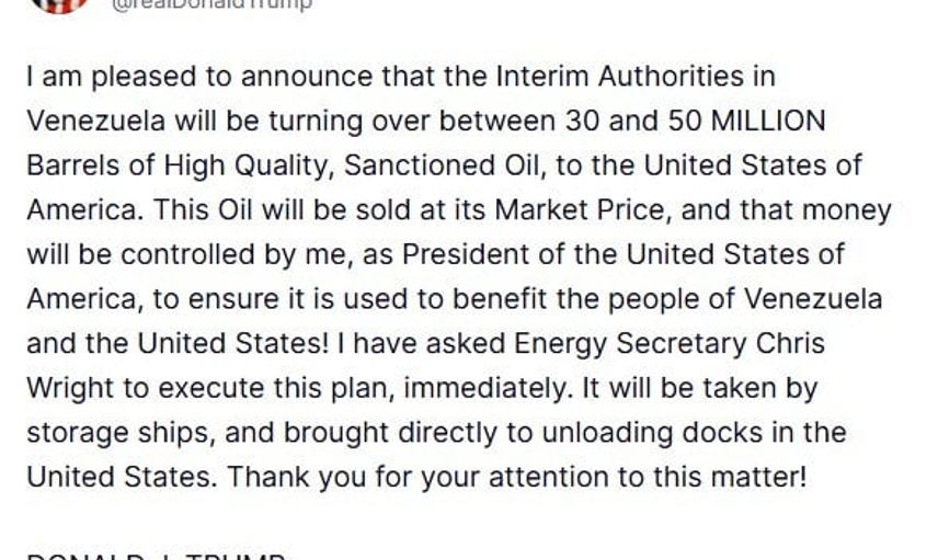 ABD Başkanı Donald Trump, Truth sosyal medya platformu üzerinden yaptığı paylaşımda, Venezuela'daki geçici yönetimin yaptırım altındaki 30 ila 50 milyon varil arasında yüksek kaliteli petrolü ABD'ye devredeceğini duyurdu.