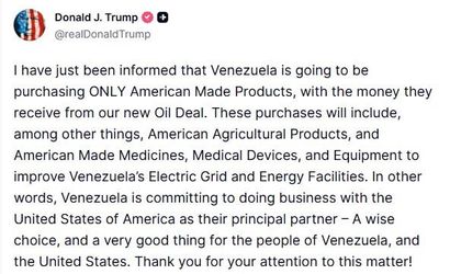 ABD Başkanı Donald Trump, Truth sosyal medya platformundan yaptığı paylaşımda Venezuela'nın kendileriyle yapılacak petrol anlaşmasından elde edeceği gelirle sadece Amerikan yapımı ürünleri satın alacağını açıkladı.