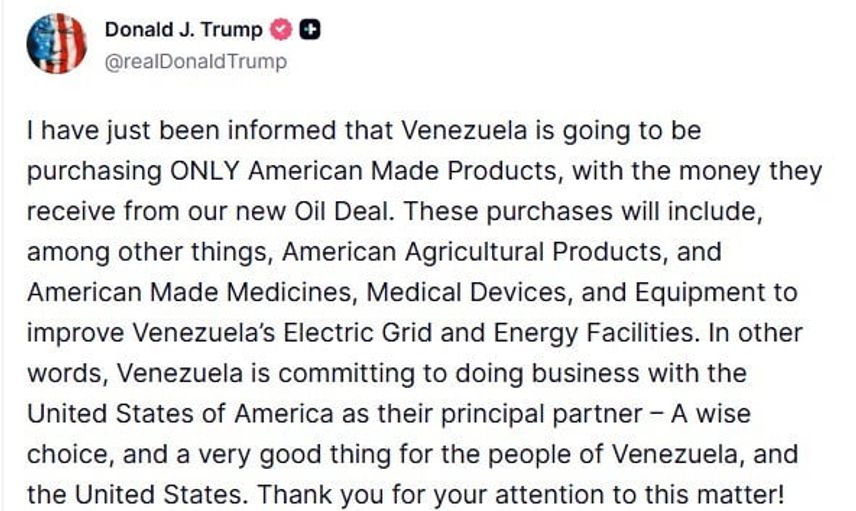 Trump, paylaşımında elde edilen bilgilerin Venezuela'nın bu gelirleri şu alanlarda kullanacağını gösterdiğini belirtti: Amerikan tarım ürünleri, Amerikan üretimi ilaçlar, tıbbi cihaz ve ekipmanlar ile Venezuela’nın elektrik şebekesi ve enerji tesislerini iyileştirmeye yönelik ekipmanlar.
