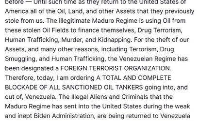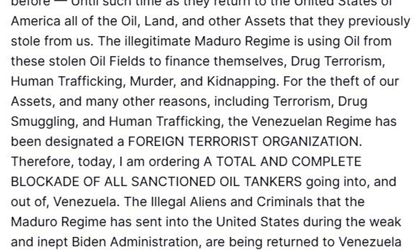 Trump, paylaşımında, 'Venezuela’ya giren ve Venezuela’dan çıkan tüm yaptırıma tabi petrol tankerlerine tam ve kapsamlı bir abluka emri veriyorum' ifadelerini kullandı. Ayrıca Venezuela’nın Güney Amerika tarihinin şimdiye kadar gördüğü en büyük donanma tarafından tamamen kuşatıldığını ve bu kuşatmanın daha da büyüyeceğini belirtti.