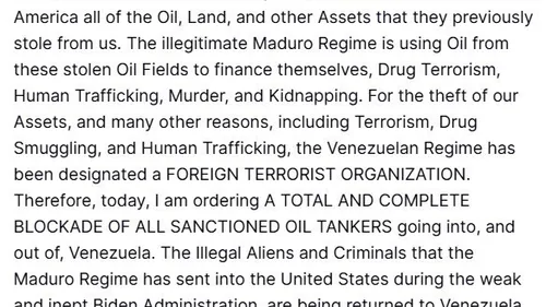 Trump, Venezuela rejimini 'Yabancı Terör Örgütü' ilan ettiğini ve yaptırıma tabi petrol tankerlerine tam abluka emri verdiğini açıkladı.