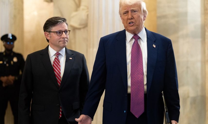 ABD Başkanı Donald Trump (sağda), Cumhuriyetçilerle toplantı öncesinde Kongre binasının girişinde basın mensuplarına vergi indirimiyle ilgili gündemi değerlendirdi. Temsilciler Meclisi Başkanı Mike Johnson (solda) da Trump’a eşlik etti.