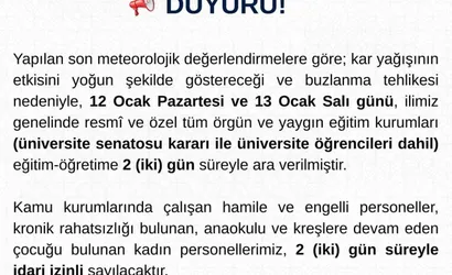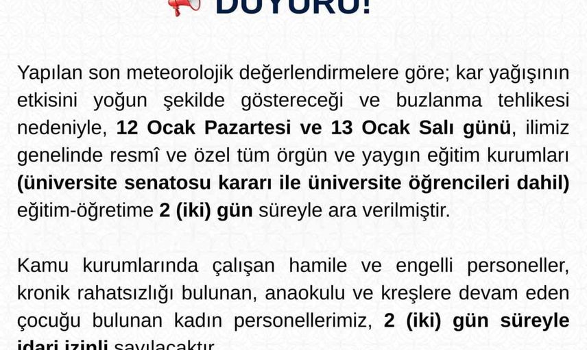 Açıklamada şu ifadeler yer aldı: "Yapılan son meteorolojik değerlendirmelere göre kar yağışının etkisini yoğun şekilde göstereceği ve buzlanma tehlikesi nedeniyle 12 Ocak Pazartesi ve 13 Ocak Salı günü, ilimiz genelinde resmi ve özel tüm örgün ve yaygın eğitim kurumları (üniversite senatosu kararı ile üniversite öğrencileri dahil) eğitim-öğretime 2 gün süreyle ara verilmiştir. Kamu kurumlarında çalışan hamile ve engelli personeller, kronik rahatsızlığı bulunan, anaokulu ve kreşlere devam eden çocuğu bulunan kadın personellerimiz, 2 gün süreyle idari izinli sayılacaktır" denildi.