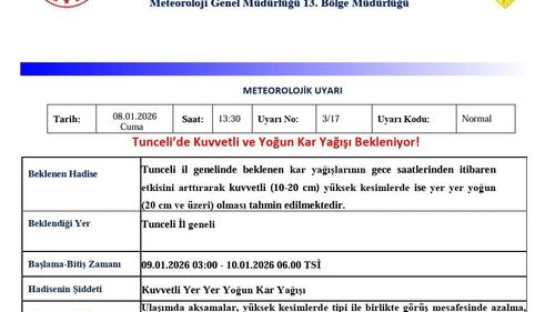 Meteoroloji 13. Bölge Müdürlüğü, Tunceli'de sabah saatlerinden itibaren karın kuvvetli (10-20 cm), yükseklerde yer yer yoğun (20 cm+) olacağını bildirdi.