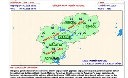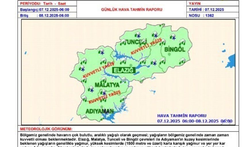 Meteoroloji 13’üncü Bölge Müdürlüğü tarafından yapılan açıklamada: "Bölgemiz genelinde beklenen kuvvetli yağışların, Elazığ, Malatya, Tunceli ve Bingöl çevreleri ile Adıyaman’ın kuzey kesimlerinde kuvvetli yağmur yüksek kesimlerinde ise (Bin 500 metre rakım üzeri) kuvvetli karla karışık yağmur ve kar yağışı beklenmektedir. Bu nedenle oluşması beklenen ani sel, su baskını, ulaşımda aksamalar, kar yağışı olan yerlerde buzlanma ve don olayı, yağış anında kuvvetli rüzgar ve tipi gibi olumsuzluklara karşı dikkatli olunmalıdır" denildi.