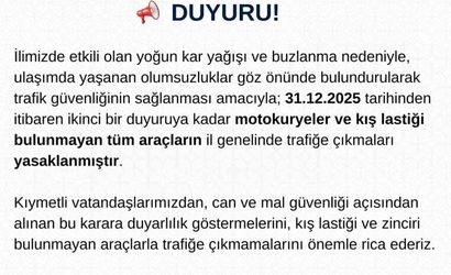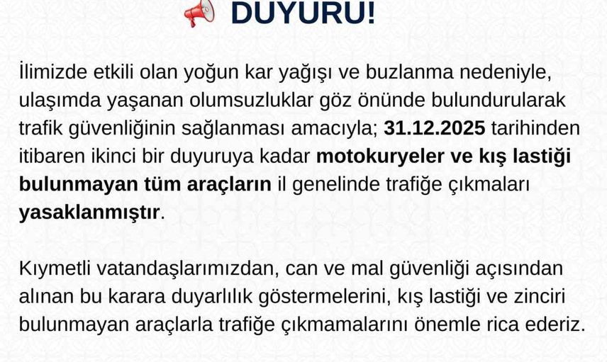 Tunceli Valiliği tarafından yapılan açıklamada şu ifadelere yer verildi: 'İlimizde etkili olan yoğun kar yağışı ve buzlanma nedeniyle, ulaşımda yaşanan olumsuzluklar göz önünde bulundurularak trafik güvenliğinin sağlanması amacıyla; 31.12.2025 tarihinden itibaren ikinci bir duyuruya kadar motokuryeler ve kış lastiği bulunmayan tüm araçların il genelinde trafiğe çıkmaları yasaklanmıştır. Kıymetli vatandaşlarımızdan, can ve mal güvenliği açısından alınan bu karara duyarlılık göstermelerini, kış lastiği ve zinciri bulunmayan araçlarla trafiğe çıkmamalarını önemle rica ederiz'