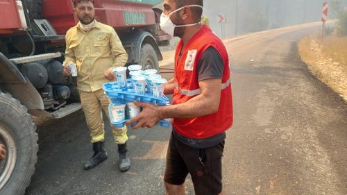 Türk Kızılay, orman yangınlarına müdahale eden ekiplere ve etkilenen vatandaşlara beslenme hizmeti sunuyor.