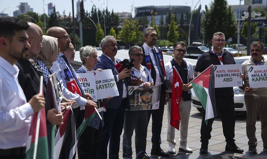 Ankara'da büyükelçilik önünde toplanan grup, Gazze'de yaşamını yitiren gazetecilerin fotoğraflarıyla tepki gösterdi