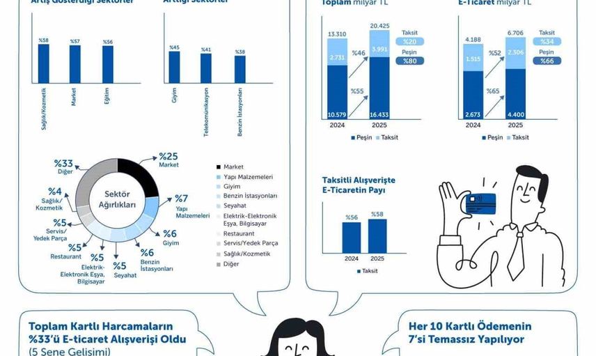 2025 yılında e-ticaret hacmi 6 trilyon 706 milyar TL olarak gerçekleşti ve toplam kartlı alışverişler içindeki payı yüzde 32,8 oldu. Son beş yıllık veriler e-ticaretin kartlı harcamalar içindeki payının istikrarlı şekilde arttığını gösteriyor. Sektör bazında e-ticaretin toplam sektör harcamaları içindeki payı en yüksek olan alanlar; seyahat yüzde 57, elektrik-elektronik eşya ve bilgisayar yüzde 51 ve yapı malzemeleri yüzde 46 olarak öne çıktı.