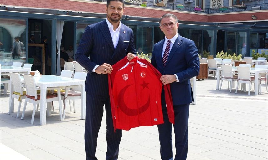 Türkiye Güreş Federasyonu Başkanı Taha Akgül (solda), Doğu ve Güneydoğu Anadolu Bölgesi ziyaretleri kapsamında Van Valisi Ozan Balcı (sağda) ile bir araya geldi.