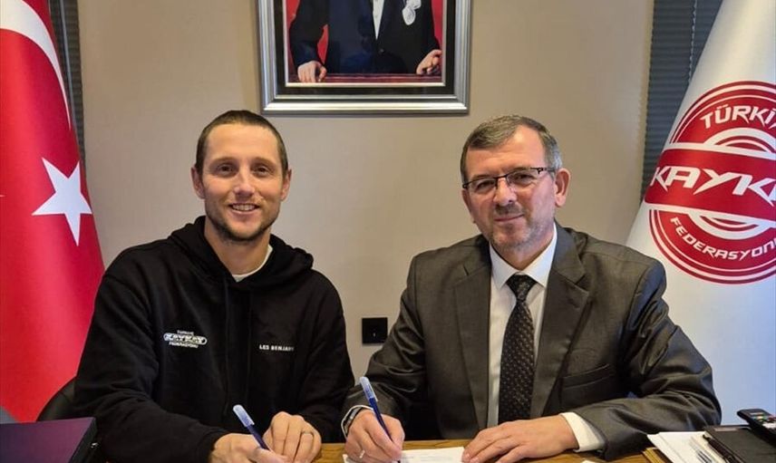 Türkiye Kaykay Federasyonu, Los Angeles 2028 Olimpiyatları hazırlıkları kapsamında, Kanadalı danışman antrenör Kael Hill (solda) ile yeniden anlaştı. İmza törenine katılan Türkiye Kaykay Federasyonu Başkanı Fahrettin Yıldız (sağda), açıklamada bulundu.