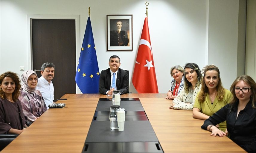 Türkiye'nin Avrupa Birliği (AB) Daimi Temsilcisi Büyükelçi Faruk Kaymakcı (sol 4), öğretmenlerin yenilikçi eğitim araçlarını ve yapay zekayı derslerde kullanmasının artırılmasına yönelik Erasmus projesinin yürütücü ve katılımcı heyetini kabul etti.