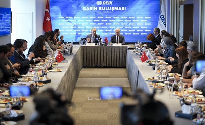 Dış Ekonomik İlişkiler Kurulu (DEİK) Başkanı Nail Olpak (sağda) ve DEİK Türkiye Avrupa İş Konseyleri Koordinatör Başkanı Mehmet Ali Yalçındağ (solda) DEİK Genel Merkezi'nde düzenlenen basın buluşmasına katıldı.