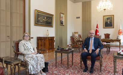 Türkiye Büyük Millet Meclisi Başkanı Numan Kurtulmuş (sağda), Finlandiya'nın Ankara Büyükelçisi Pirkko Mirjami Hamalainen’i (solda) kabul etti.