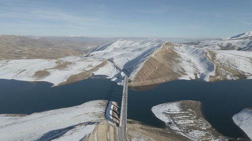 Erzincan Çayırlı'daki Turnaçayırı Barajı ve köprüsü, yoğun kar yağışı sonrası drone görüntüleriyle kartpostallık kış manzaraları oluşturdu.