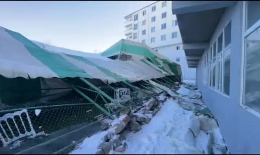 Iğdır’ın Tuzluca ilçesinde, yaklaşık bir yıldır düğün salonu olarak kullanılan halı saha, günlerdir etkili olan yoğun kar yağışının ardından çöktü.