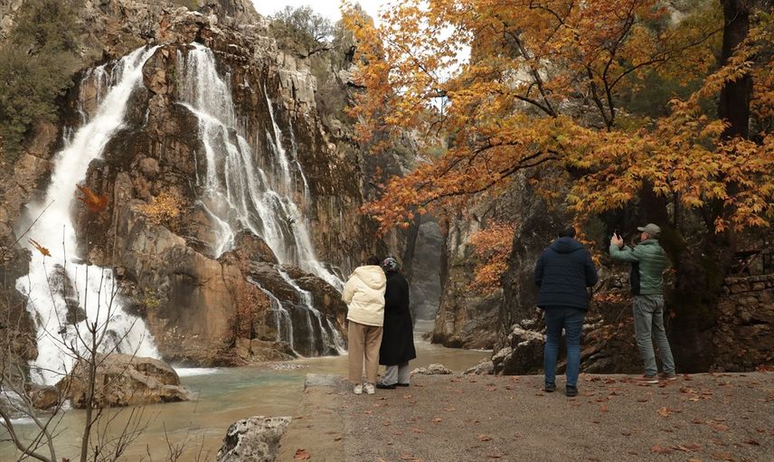Uçansu Şelalesi'nin etrafı, sarı, kahverengi ve yeşil tonlarının hâkim olduğu farklı renklere büründü. Şelale, birkaç koldan dökülerek Alara Çayı'na hayat veriyor. Kış aylarında su debisinin artması, günübirlik ziyaretçi sayısını da artırdı.
