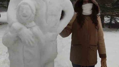 Uludağ Sarıalan'da Hakan Babaoğlu'nun anne ve çocuğu tasvir eden kardan heykeli gerçekçi detaylarıyla dikkat çekti; ziyaretçiler fotoğraf çekti ve çalışmayı izledi.